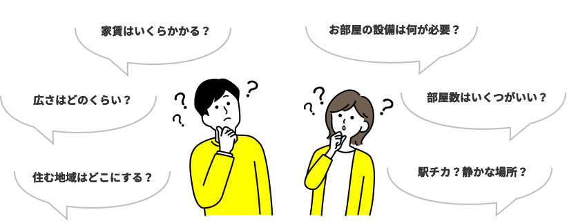お互いの優先順位を明確にし、自分たちにとって何が必要なのか考えていきましょう。お部屋に求める条件を2人でよく話し合うことで、理想のお部屋が見つかる可能性がグッと高まります。