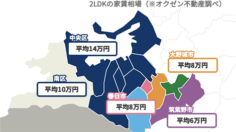 福岡イチの繁華街を抱える中央区の家賃相場は、約14万円と少々割高。都市部へアクセスしやすい人気のベッドタウンの南区は約10万円。さらに南側にある筑紫野市や春日市、大野城市といった自然豊かなエリアは、なんと平均8万円以下でお部屋を借りることができます。
