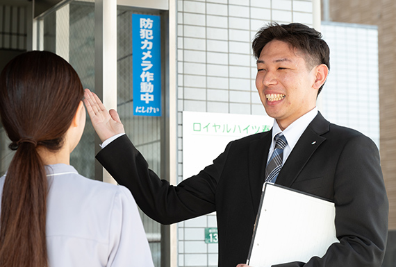 ご担当者様へ定期的に訪問いたします。ご契約物件のフォローや新たな物件のご紹介、法律・税制改定などの情報をご提供します。採用や異動で発生する物件探しも承ります。