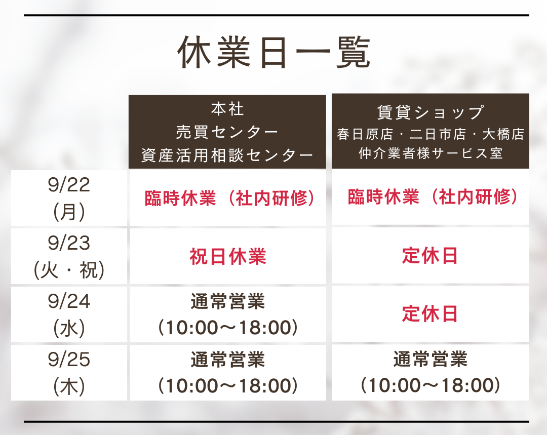 また、翌9月23日(火・祝)は祝日および定休日により休業となります。